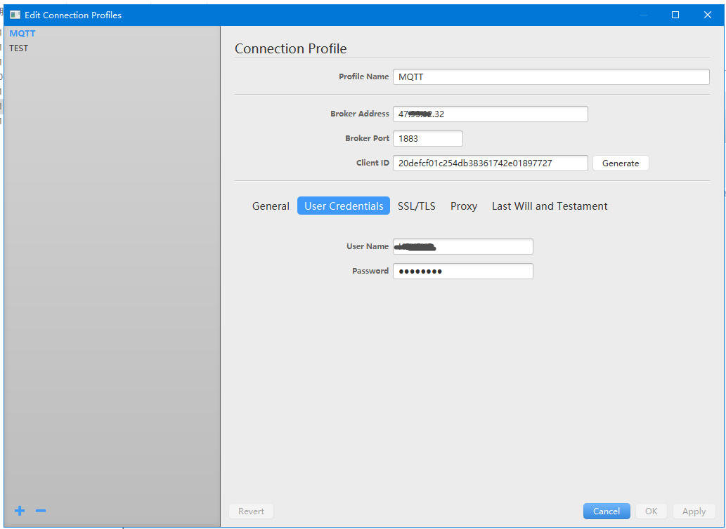 电脑下载打开MQTTfx软件,新建一个测试客户端,服务器地址填要连接的MQTT服务器地址,服务器端口填要连接的MQTT服务器端口,客户端ID不要和USR-DR164的客户端ID重复。