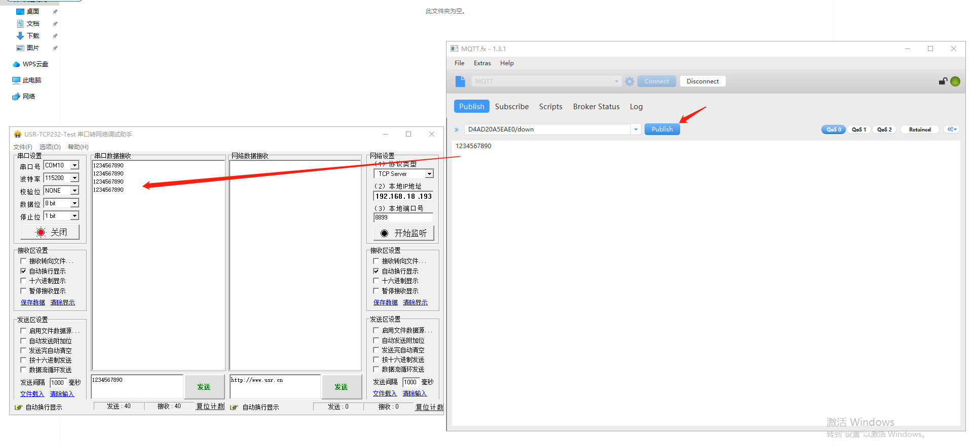 MQTTfx 软件发送数据1234567890,USR-DR164串口使用串口助手,115200波特率,打开USB-RS485串口线COM口,COM10,可以接收到数据1234567890。