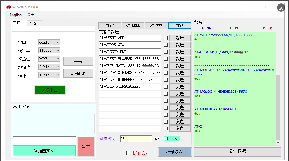 1、打开ATSetup 软件,选择COM口号COM10 ,波特率115200,打开串口,点击+++a,依次发送以下AT指令: