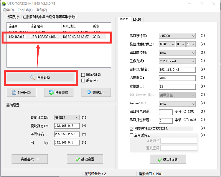 2、打开参数设置软件USR-TCP232-M4,E45-V2.3.0.78.exe (下载地址:http://www.usr.cn/Download/90.html),点击“搜索设备”,点击搜索到的模块IP,如图: