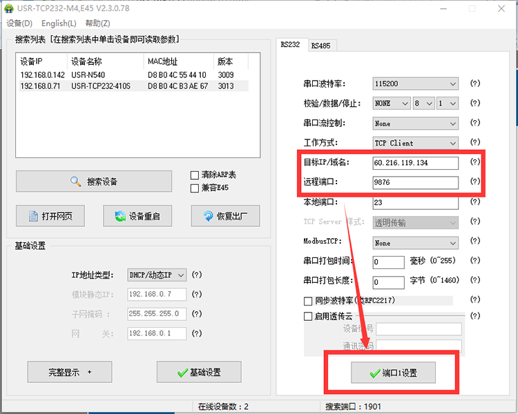 5、打开参数设置软件USR-TCP232-M4,E45-V2.3.0.78.exe ,点击“搜索设备”,点击搜索到的模块IP,选择是通过RS485串口还是 RS232串口进行通信,此处以RS232串口举例,配置参数如图,点击“端口1设置”