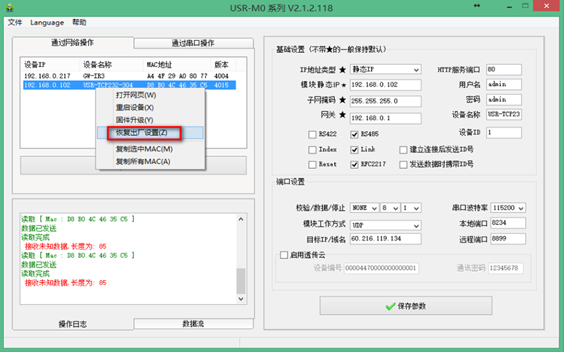 5、右击搜索到的M0产品,选择“恢复出厂设置”,升级完成。