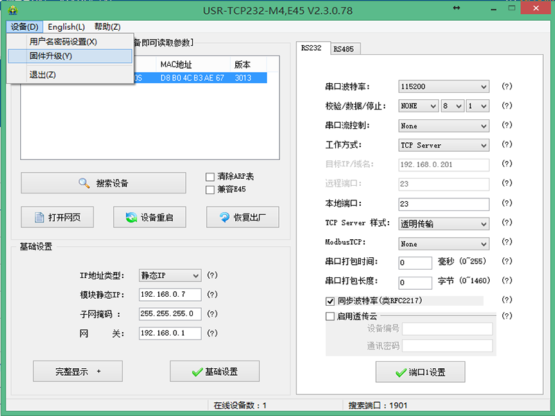 2、点击一下搜索到的M4产品,点击右上角的“设备”,选择“固件升级”。