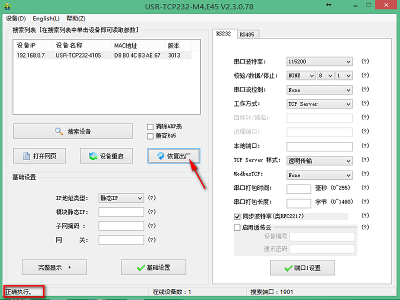 5、点击“恢复出厂设置”,左下角会显示正确执行,升级完成。