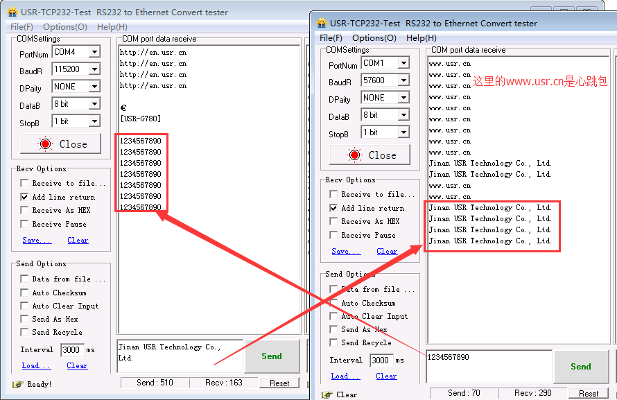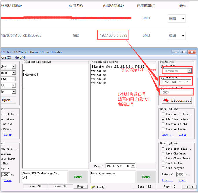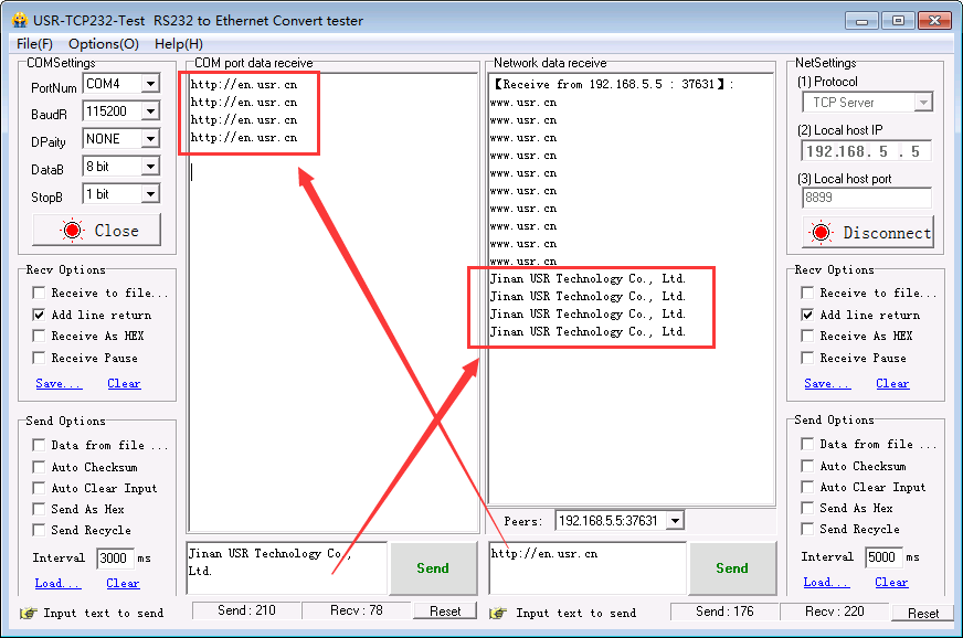 8.使用有人Test调试助手软件测试GPRS DTU串口到网络数据收发情况。