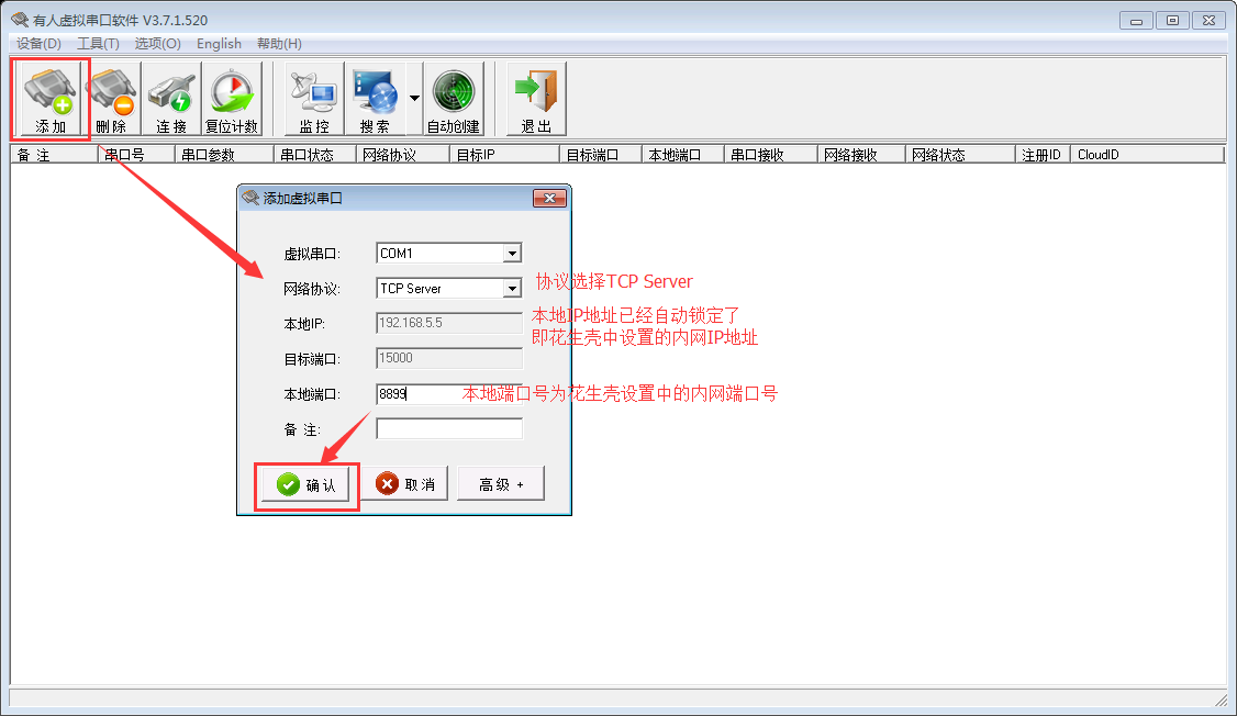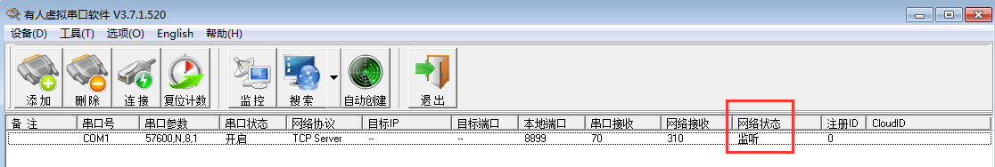 9.使用虚拟串口软件建立TCP Server网络监听(使用时需要将Test调试助手软件创建的Server监听关闭,不能同时使用)