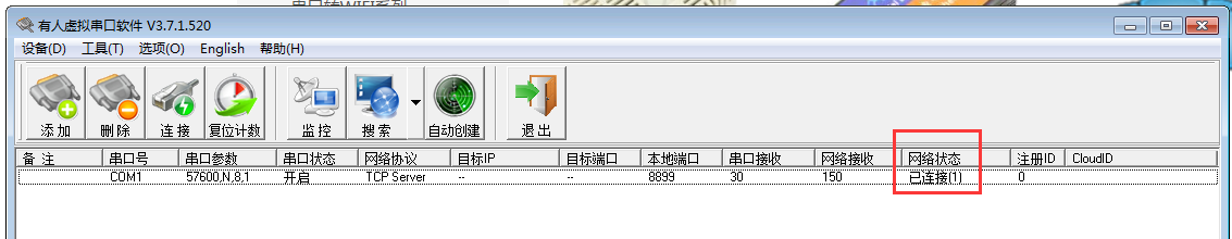如使用一个GPRS DTU建立连接时会在网络状态上显示已连接(1)。网络状态如果一直显示监听状态,请检查之前设置参数是否有误