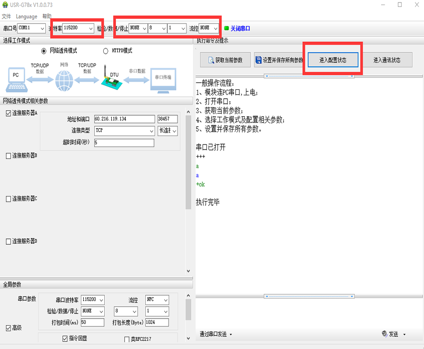 1、将USR-LTE-7S4模块插入评估板,插入sim卡,串口连接电脑,打开参数设置软件(下载地址http://www.usr.cn/Download/415.html),模块默认串口参数是115200,N,8,1。点击“进入配置状态”,如图