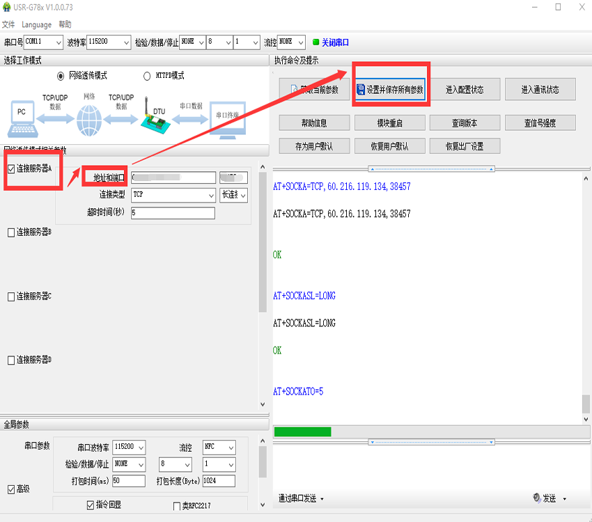 3、勾选连接服务器A,地址设置为公网服务器的公网IP,端口号为服务器上上位机软件的端口号。点击“设置并保存所有参数”,如图