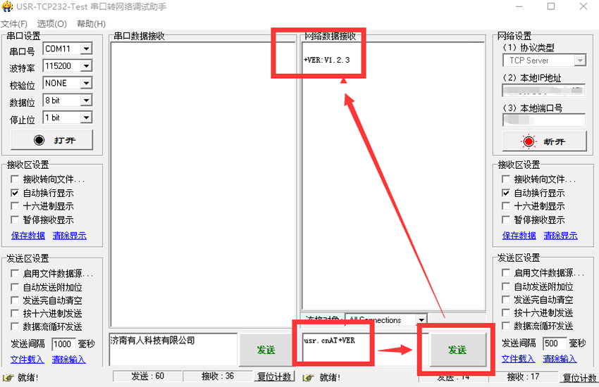 5、通过服务器端网络调试助手发送带有密码(默认是usr.cn)的AT指令可以实现网络AT指令功能,如查询模块版本号可以发送:usr.cnAT+VER?跟回车,如图