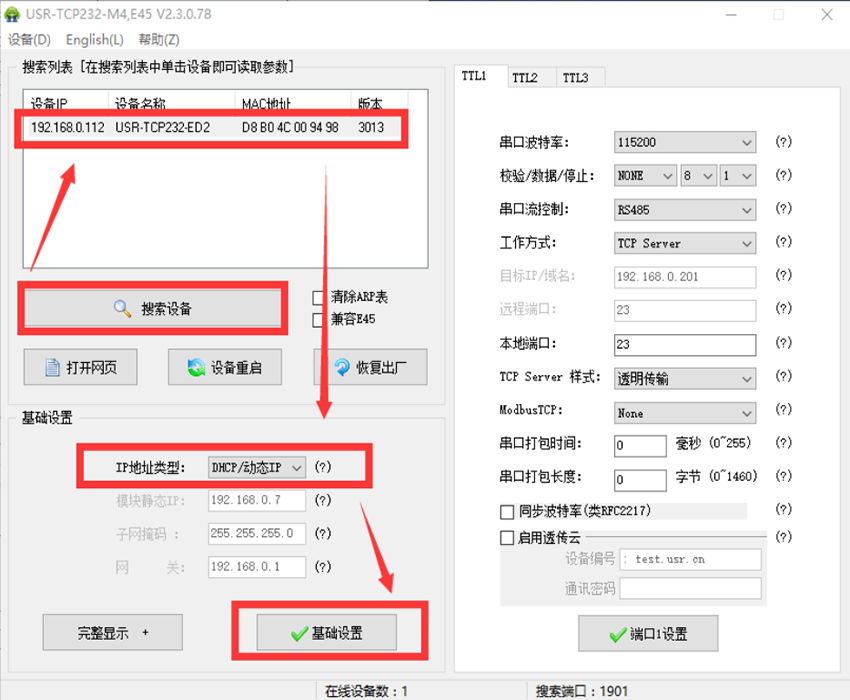 1、将M4模块网线直连电脑,打开参数设置软件(下载地址http://www.usr.cn/Download/90.html),点击“搜索设备”,点击搜索到的设备名称,将IP类型改为“DHCP”,点击“保存参数”,如图