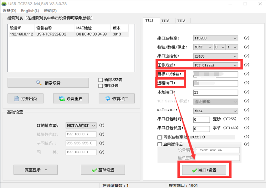 3、将M4模块网线直连路由器,电脑连入该路由器,打开参数设置软件,重新搜索设备,设置模块工作方式为“TCP Client”,目标IP设置为公网服务器的公网IP,远程端口号为服务器上上位机软件的端口号。点击“保存参数”,如图