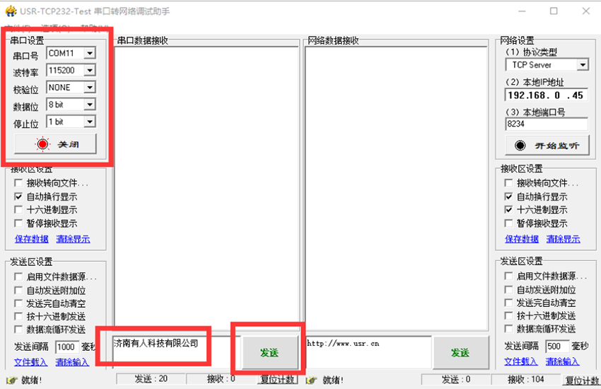 4、模块重启后,将模块串口连接电脑,打开串口调试助手,注意串口参数要和模块的串口参数一致。发送数据,此时在服务器上可以接收到串口发送的数据,如图