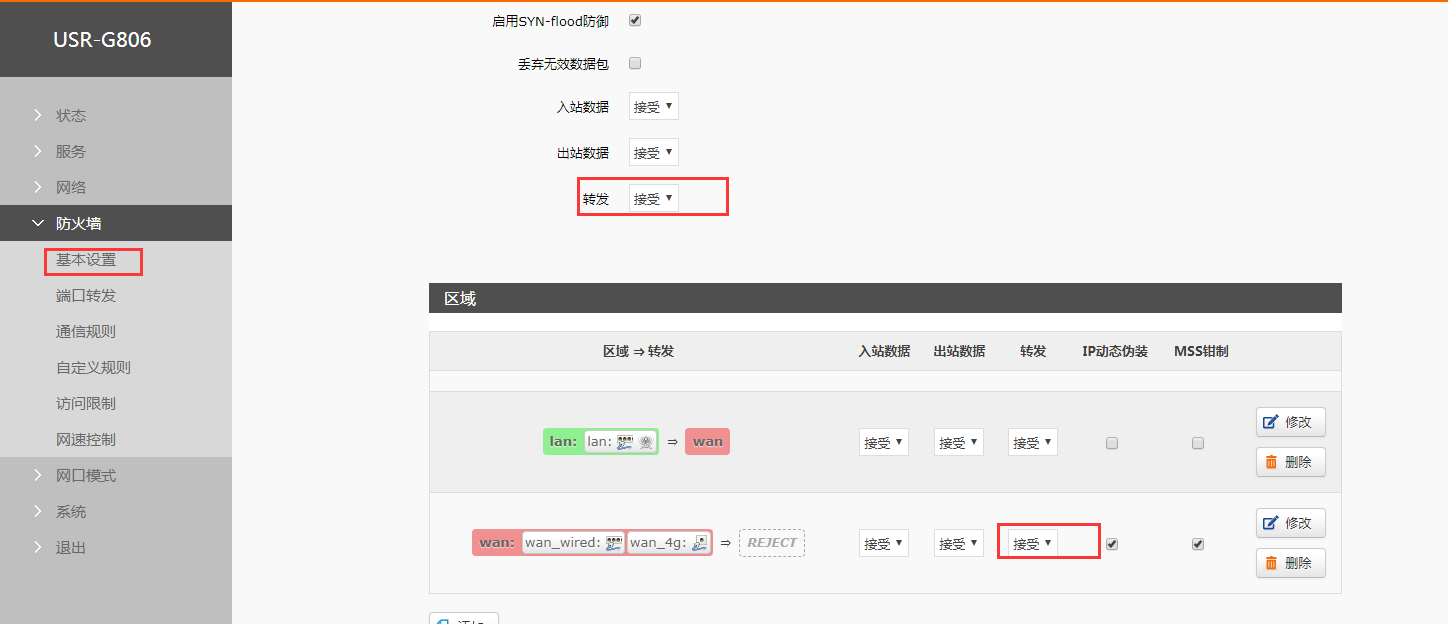 5,在防火墙基本设置内将所有拒绝设置为接受。