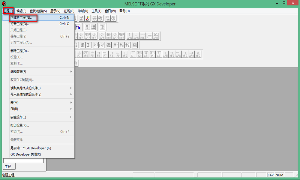七、打开三菱上位机软件GX,点击“工程-创建新工程”