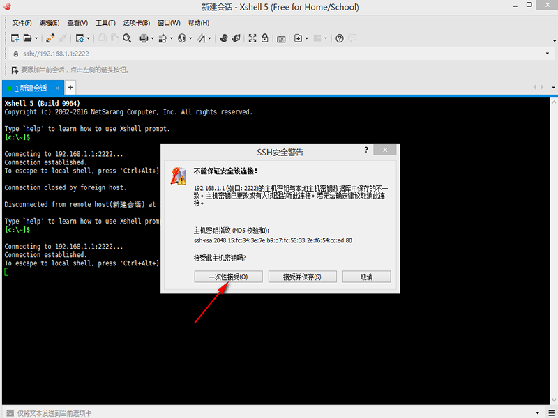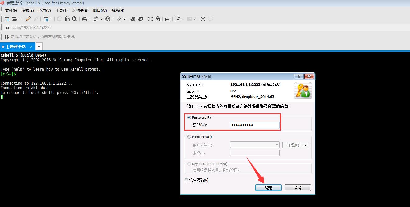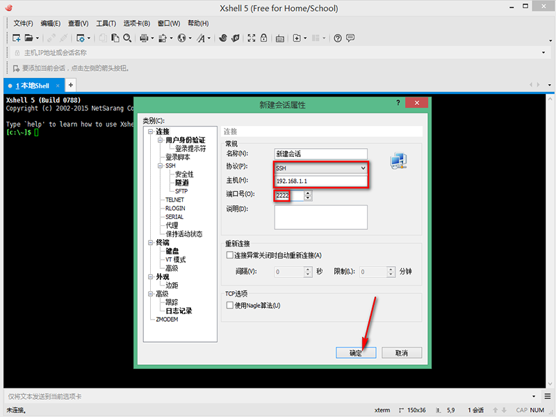 6、协议选为ssh 主机填写192.168.1.1 端口号填写2222,点击“确定”