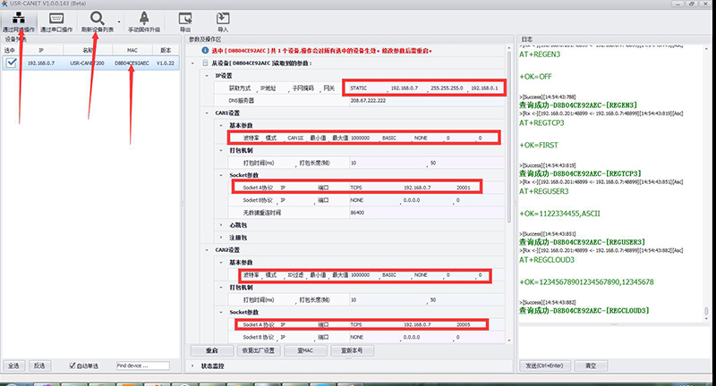 Can1为192.168.0.7-20001;can2位192.168.0.7-20005两个网络助手之间的通信如下(数据格式为13字节,按16进制发送)