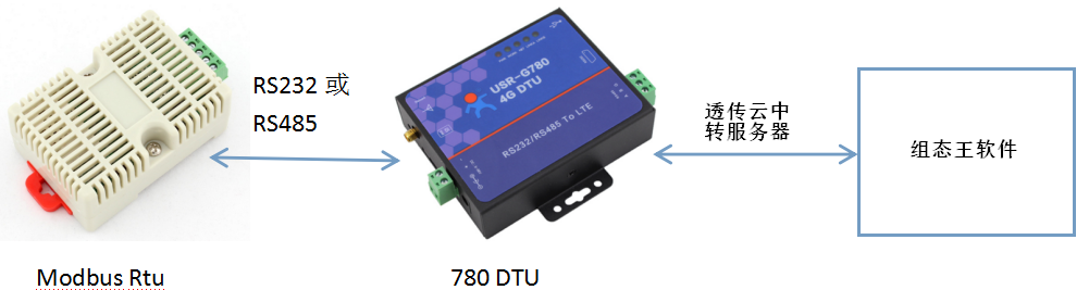 1.3实现功能:串口设备连接DTU,DTU设置参数后与透传云服务器连接,组态王连接虚拟串口软件,实现组态王发送MODBUS RTU协议的请求数据,MODBUSRTU下位机返回对应的参数值。