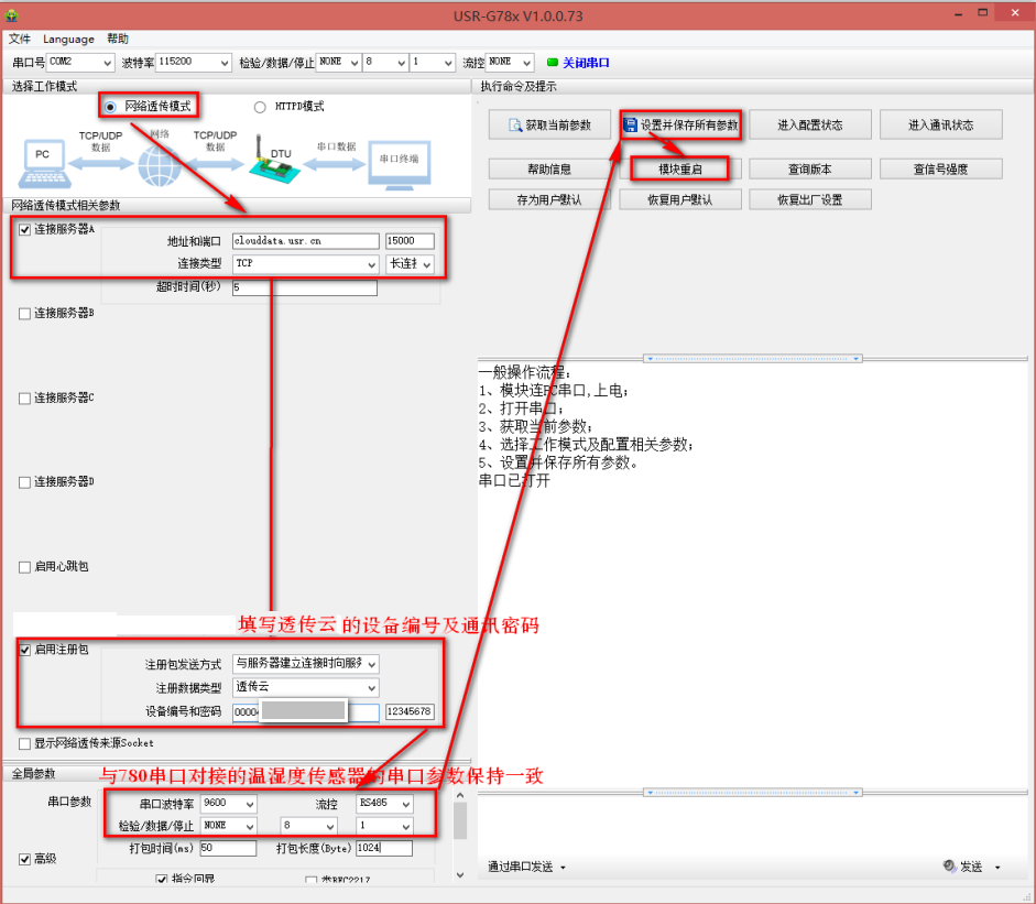 3、设置完参数后,将780串口与温湿度传感器对接上,连接服务器。