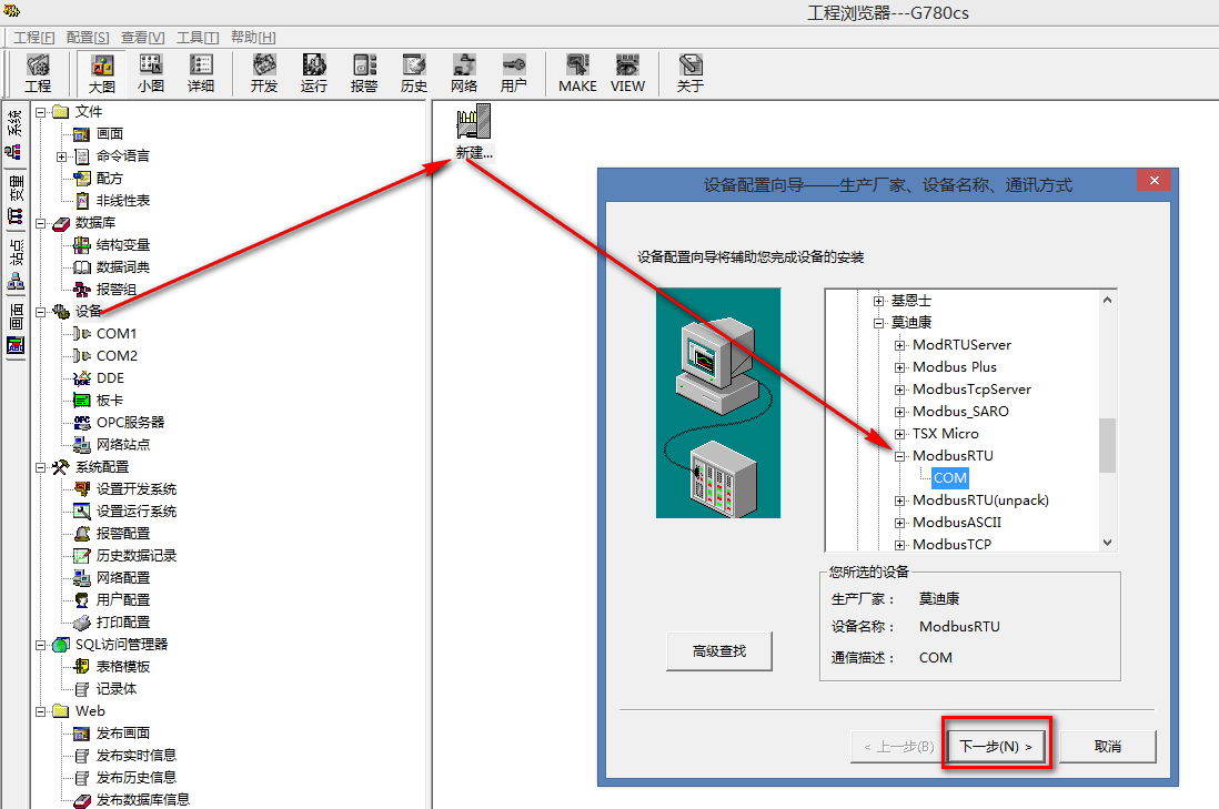 4.3点击设备,新建一个组态设备,选择 PLC-莫迪康-Modbus