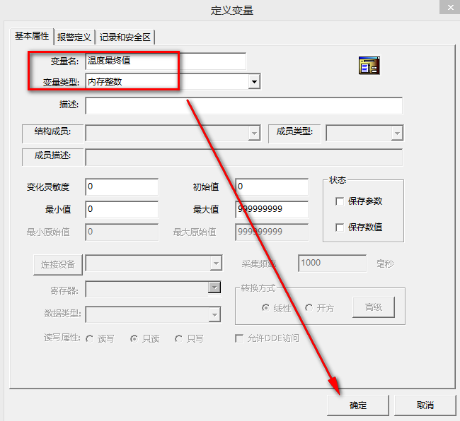 (4)新建变量名:温度最终值,选择变量类型“内存整数”,点击“确定”。