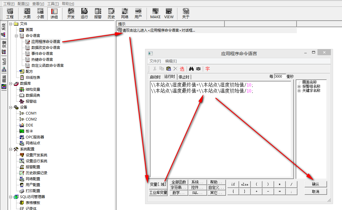 4.7点击“命令语言”中的“应用程序命令语言”,然后输入算法,“湿度初始值”采集到的数据除以10,然后将数据赋值给“湿度最终值”,此变量对应的是实际的湿度值。“温度初始值”采集到的数据除以10,然后将数据赋值给“温度最终值”,此变量对应的是实际的温度值。