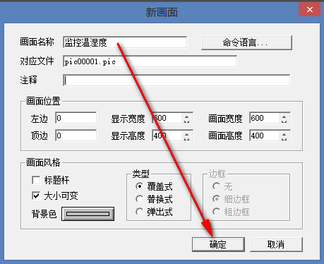 4.8点击“画面”,新建一个画面,画面名为监控温湿度,点击“确定”,进入画面编辑栏。