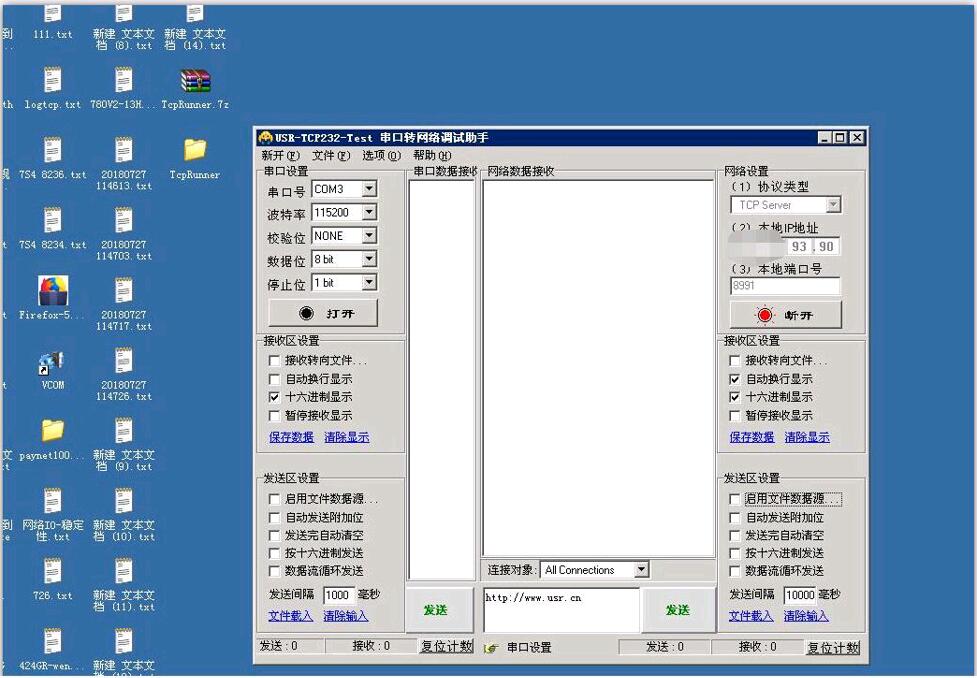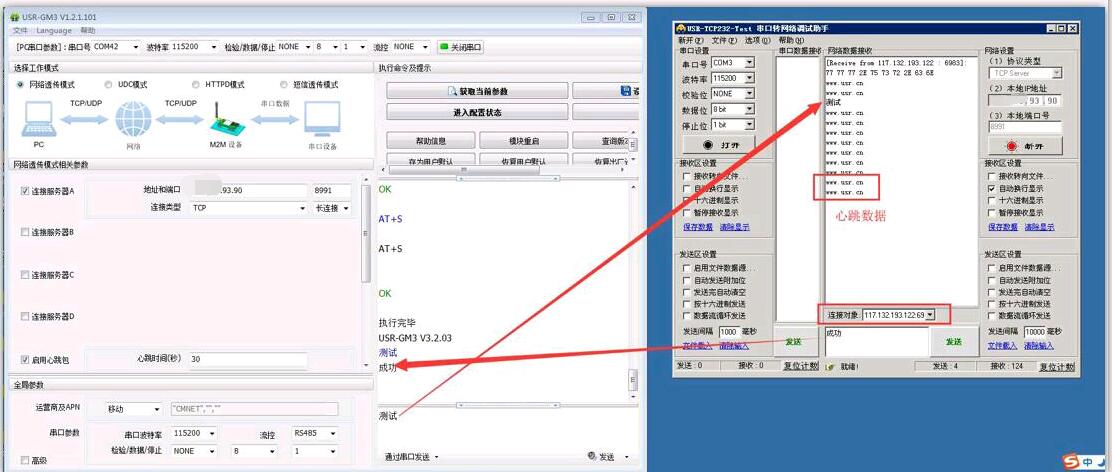 3. 在服务器端,可以看到已经有连接对象了,串口和服务器端能正常收发数据,当串口长时间不发送数据的时候,DTU会主动发送心跳包给服务器(该功能可以取消,具体参考730的软件设计手册)。
