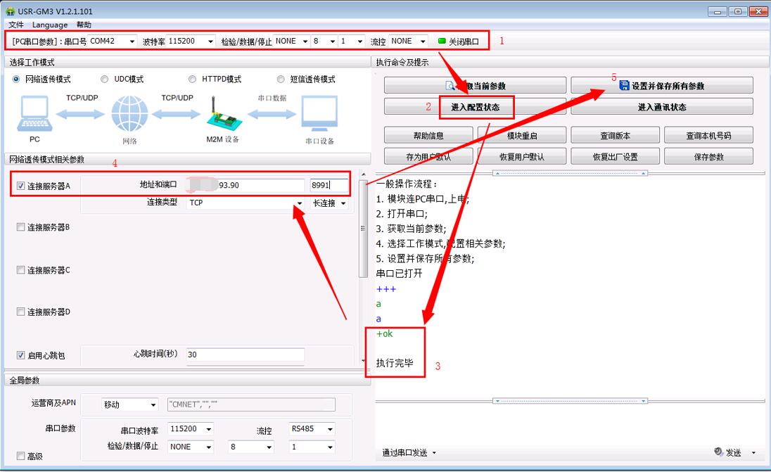 打开串口--->进入配置状态--->成功的话,会返回执行完毕--->修改服务器地址和端口--->设置并保存参数--->DTU会自动重启,重启后会连接服务器