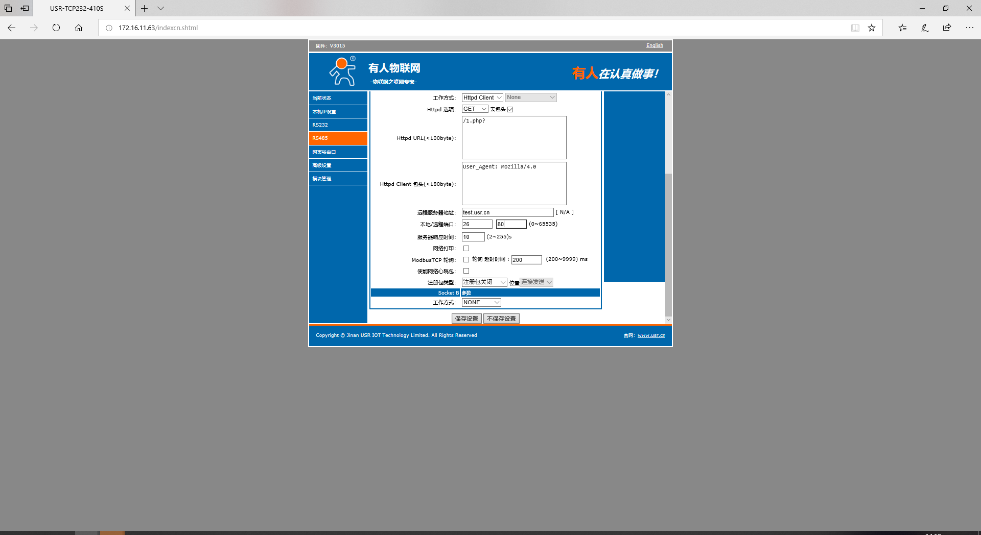 3、模块设置参数:打开设置软件,模块设置为Httpd Client模式,请求方式GET,URL为/1.php?,设置服务器地址test.usr.cn,端口80,设置并保存所有参数,重启模块。(本说明文档使用为有人测试服务器)