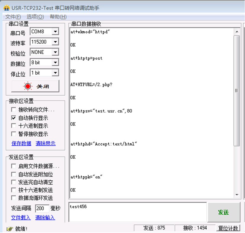 Test.usr.cn这个服务器的功能就是,串口发送什么数据,服务器就将收到的数据返回到串口端。