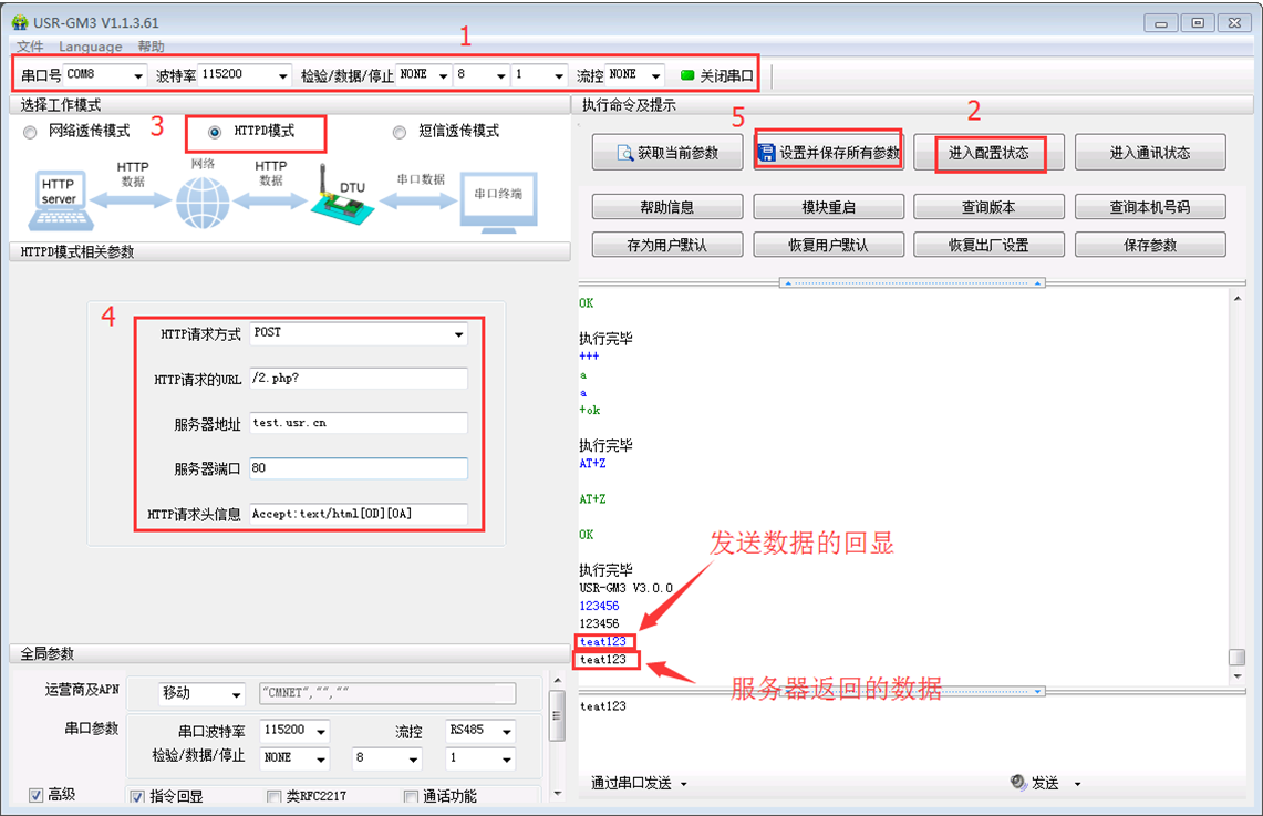 通过串口发送test123,在串口软件的接收串口就会收到123,见下图中的数据。图中的接收框中收到2次 test123,上面那个是发送数据的回显,下面的test123是服务器返回的数据。回显功能是这个设置软件的 功能,换成其他的软件测试,就只有服务器的返回数据。