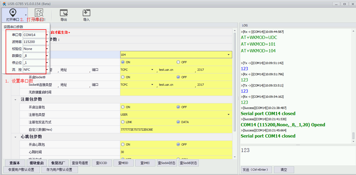 B.可以先读取下参数,可以看到,出厂默认是工作的“NET”模式,服务器是我司测试服务器:test.usr.cn,端口号是:2317