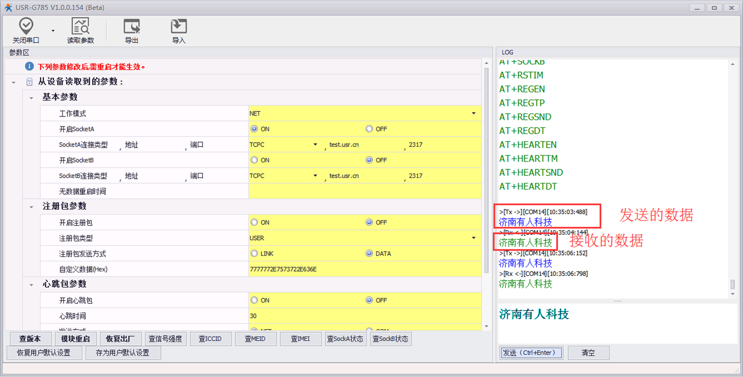 通过串口发送“济南有人科技”,软件上会显示两个“济南有人科技’,一个是发送的数据(软件自带回显功能),一个是接收到的服务器的数据(测试服务器的功能是串口发送什么数据,服务器就返回什么数据),能够收到服务器返回的数据说明785工作没有问题。