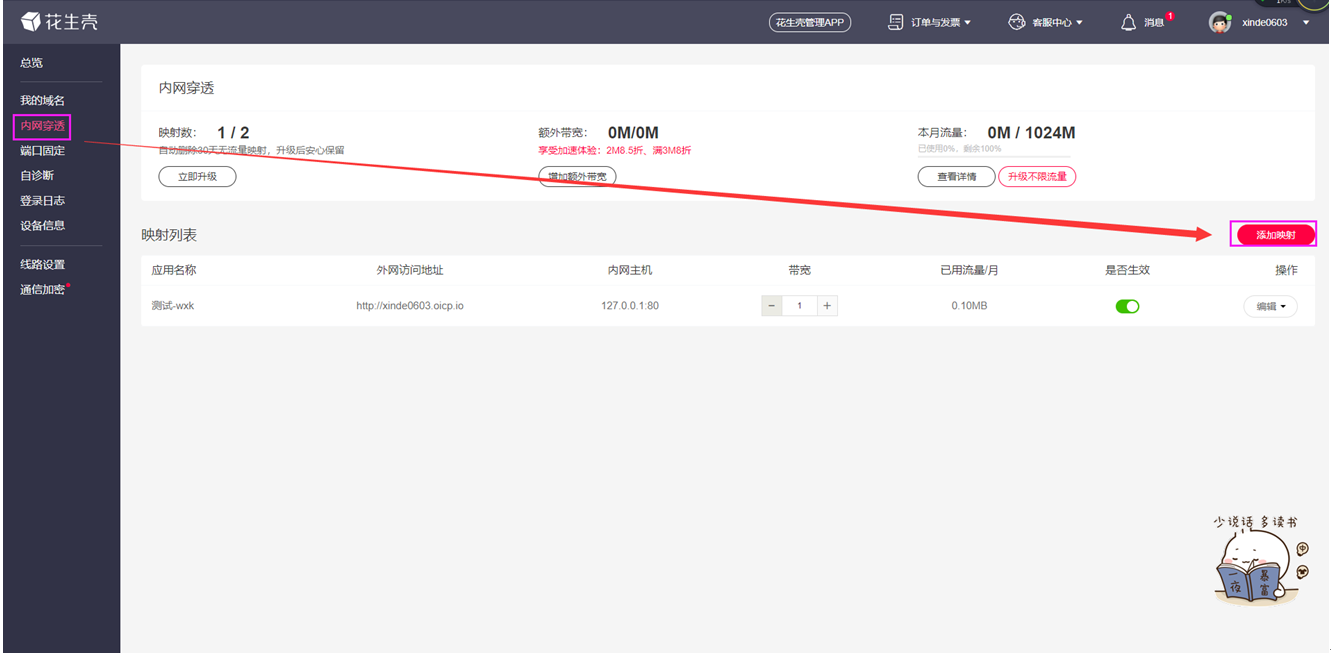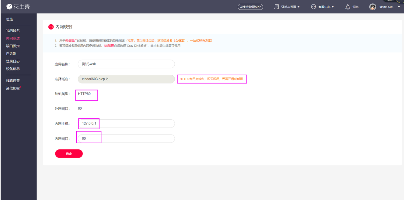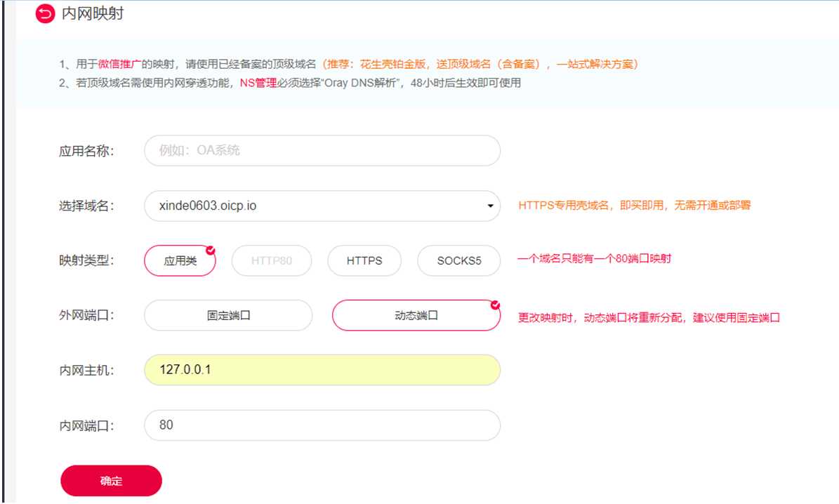 4. 选择内网穿透,添加映射(可以用应用类,也可以用HTTP),主机和端口号按照图示填写