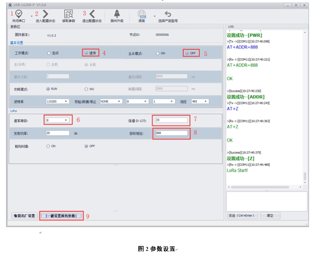 打开LoRa设置软件(LG207和LG206-P选择同一个),依次点击打开串口(选择A、B对应的串口号,串口参数:115200,None,8,1,NFC)、进入配置状态、读取参数、配置上表中的参数、一键设置所有参数,关闭LoRa设置软件。