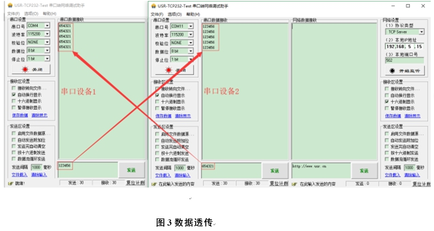 (3)启动两个USR-TCP232-Test(模拟串口设备1,2)分别连接LoRa数传终端A、B的串口,使用串口设备1发送数据串口设备2可接收数据(反之亦然),通信效果如下图所示: