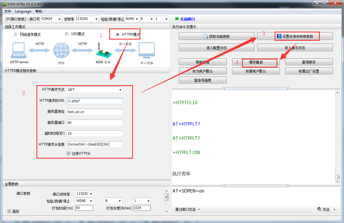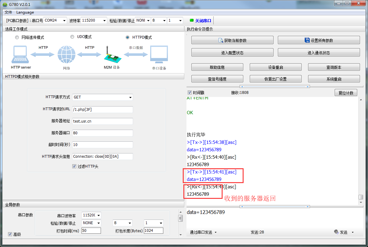 (1) 硬件连接:装上sim卡,接上天线,780 V2的串口通过UAB转RS232/485接到PC上,用我司提供的适配器供电。