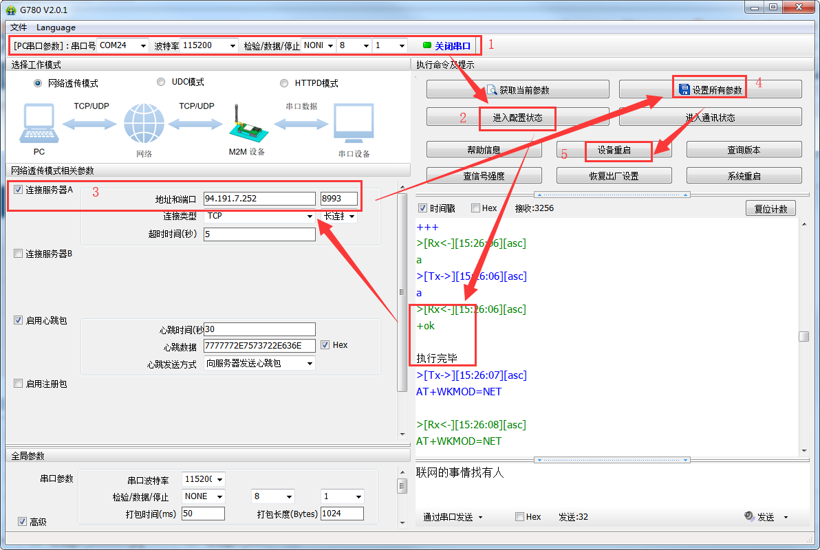 打开串口--->进入配置状态--->成功的话,会返回执行完毕--->修改服务器地址和端口--->设置并保存参数--->模块重启