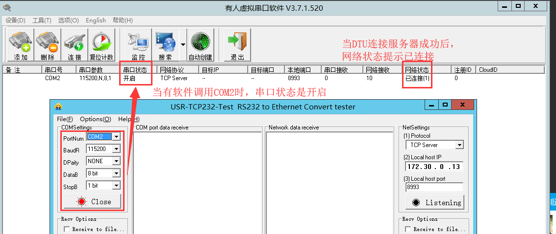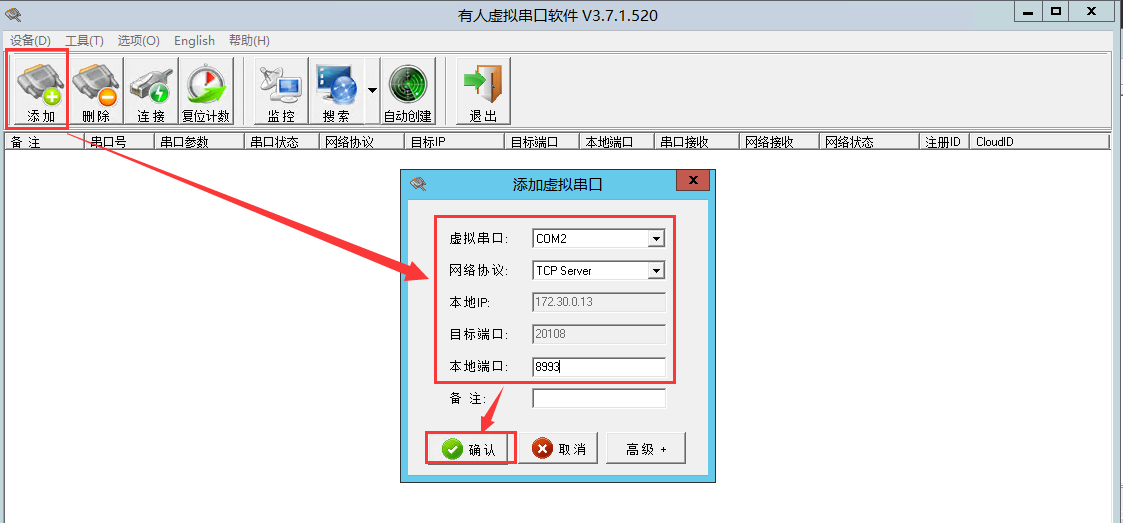 4. 有时客户的服务器端安装的软件需要通过串口来读取数据,这个可以通过我司的虚拟串口实现。安装虚拟串口后,设置方法:添加虚拟串口-->选择COM口-->TCP server(软件会自动锁定本地IP)-->设置本地端口号(和DTU设置的服务器端口号一致,本案例中是8993)-->确认