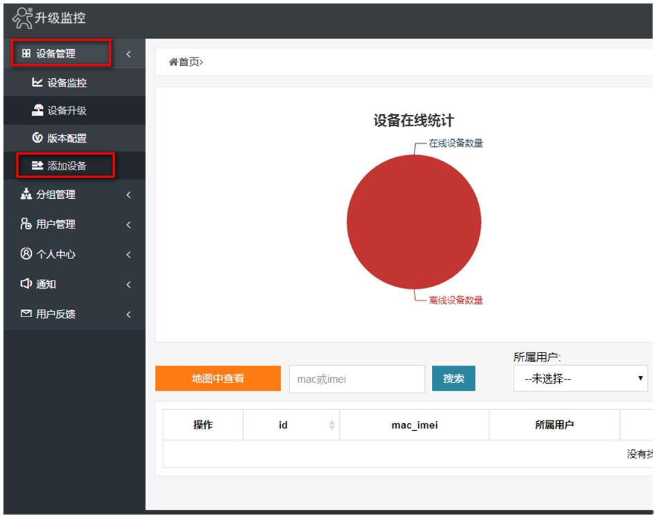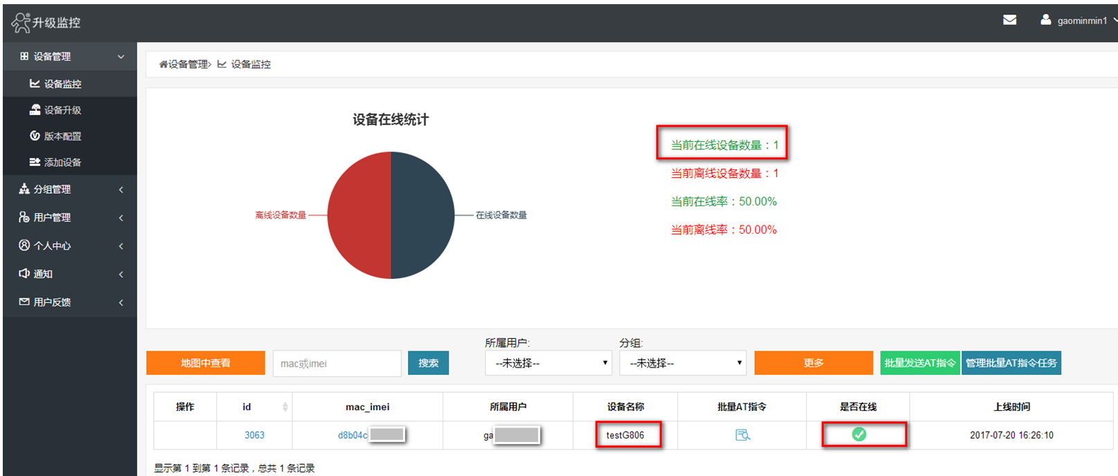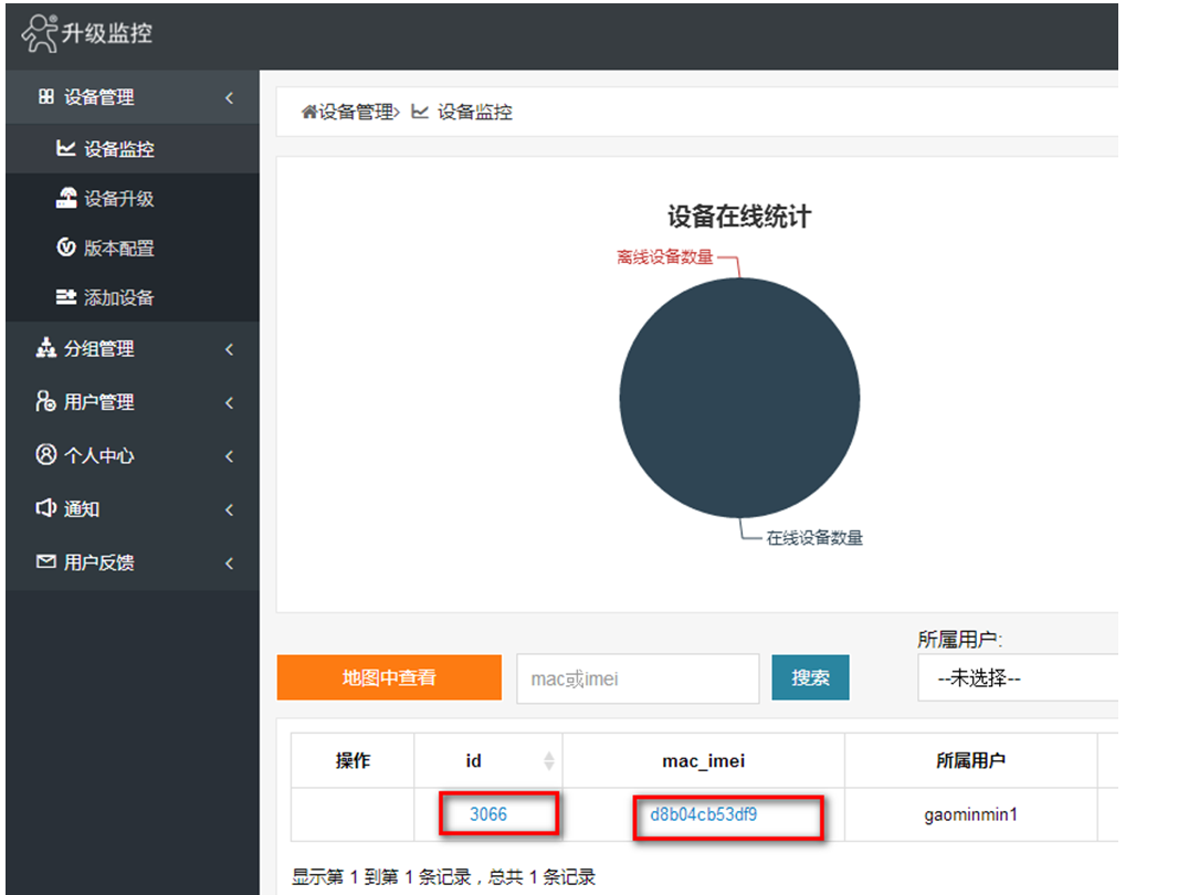 6、等待1分钟左右,点击“设备监控”,在设备监控界面,即可看到在线设备,如下