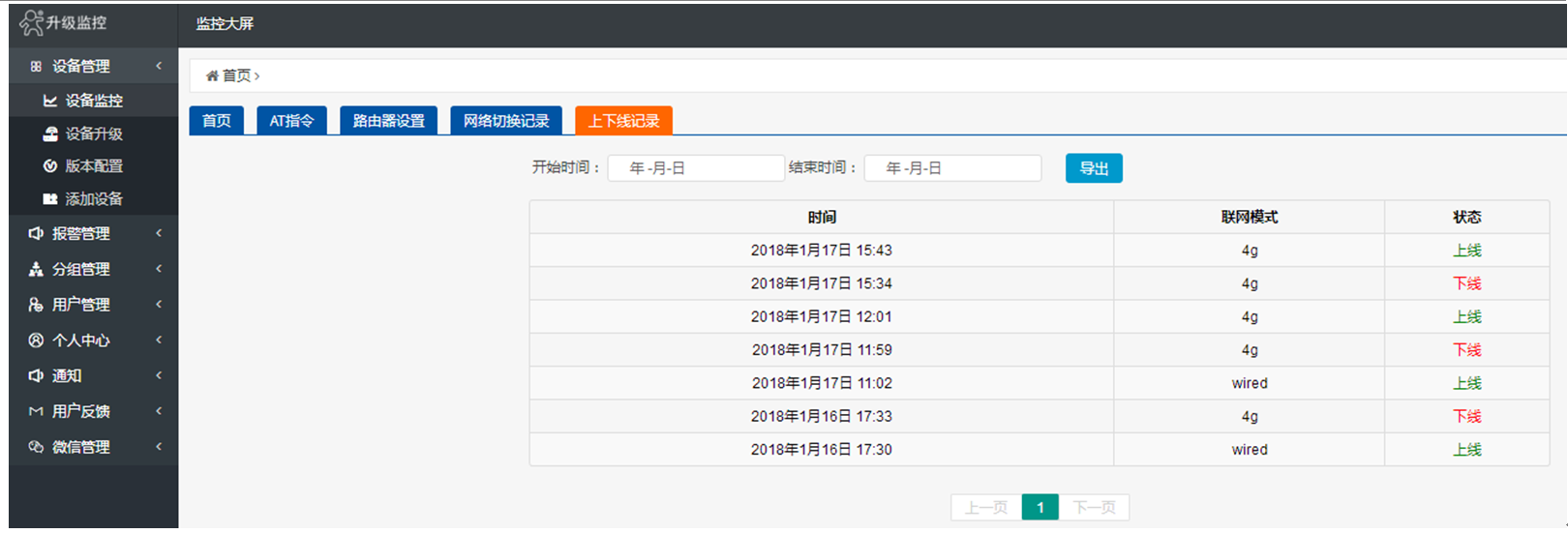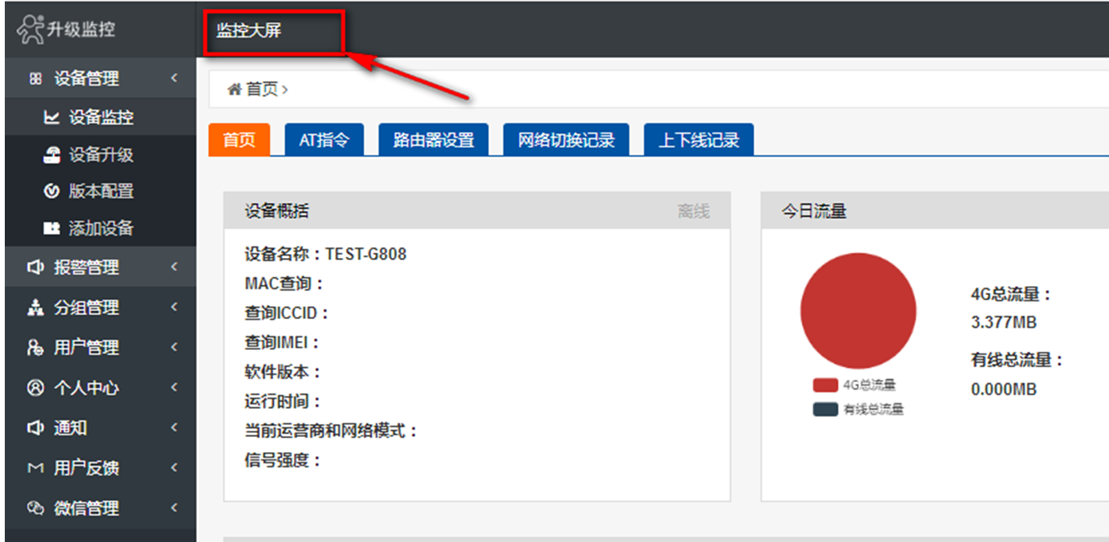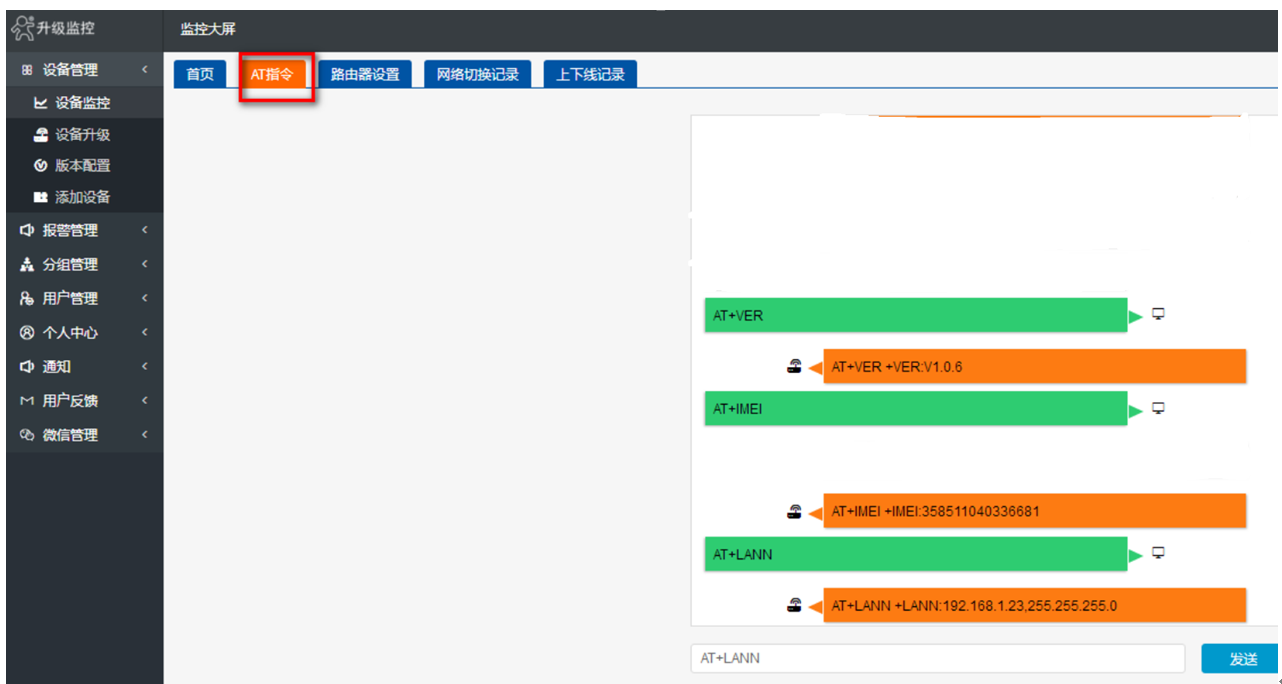 5)远程监控开关:远程监控功能打开后,可以查看设备的运行状态,远程发送AT指令控制设备