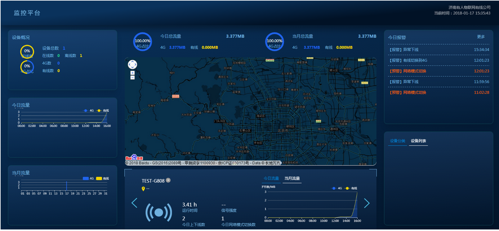 4)流量监控开关:当需要使用流量报警功能时“流量监控开关”需打开。日流量限额、月流量限额,用于进行流量报警功能,分别表示日最大使用流量和月最大使用流量。
