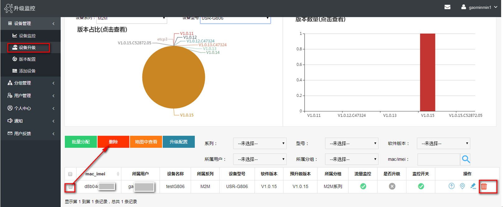 点击“设备升级”,对于要删除的设备,勾选前面的选择框然后点击“删除”,或者是直接点击垃圾桶图标进行删除设备