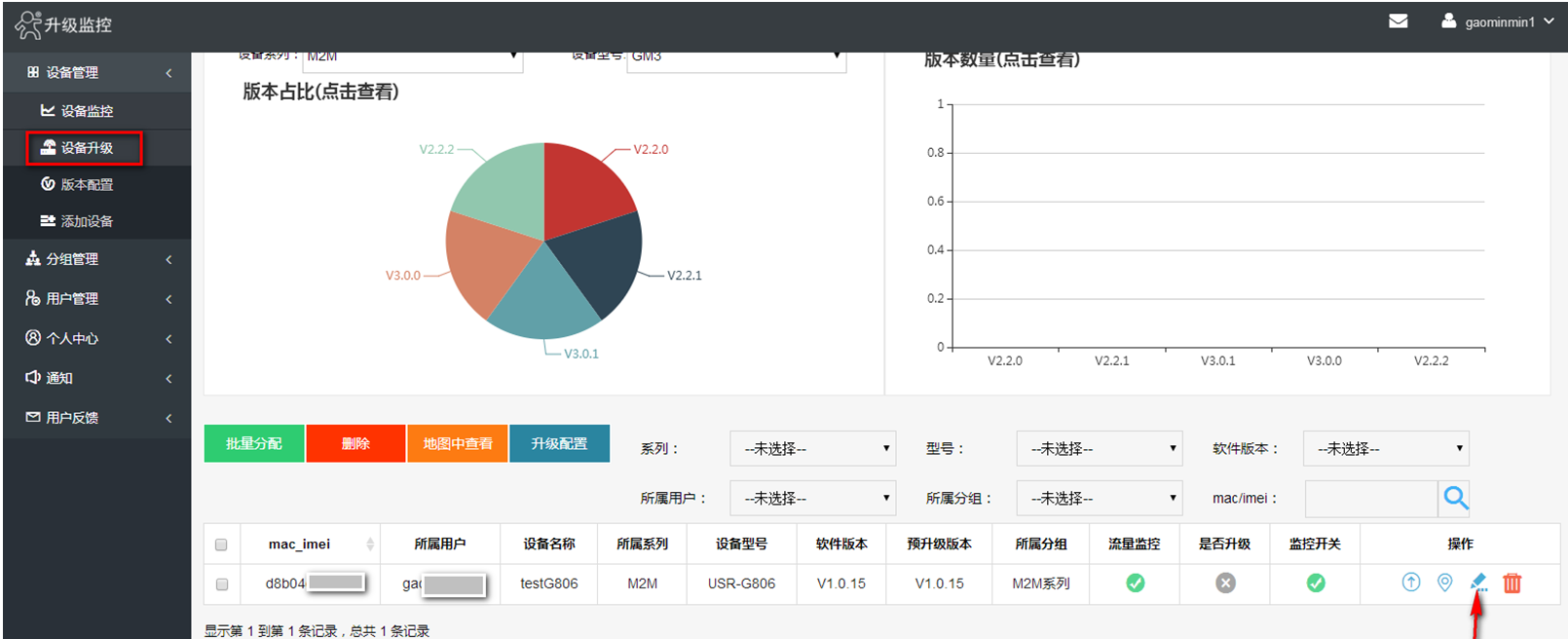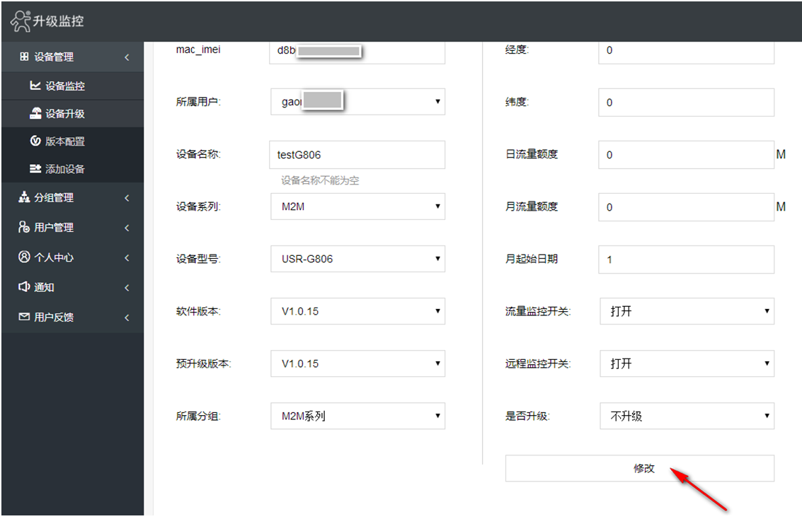 点击“设备升级”,对于要修改的设备信息,点击编辑按钮,出来修改信息的界面后,直接更改,更改完后,点击“修改”即可保存信息。