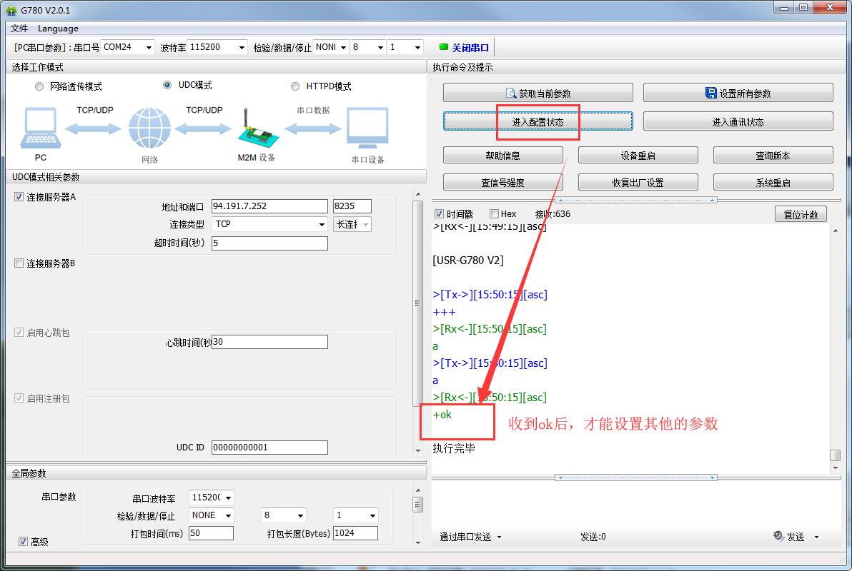 注意:设置的时候需要先点击“进入配置状态”,收到+ok后才能设置其他参数,否则需要先解决这个问题,解决办法参考