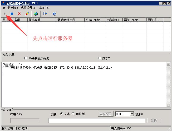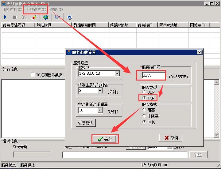 系统设置-->设置服务IP和端口号-->选择服务类型-->服务模式默认-->确定