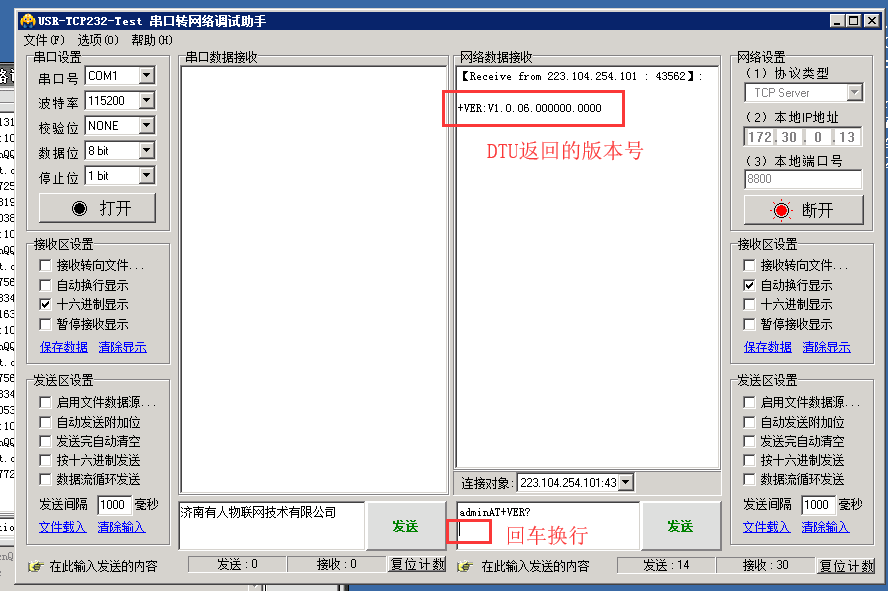 2. 连接成功后,可以从服务器端发送网络AT指令来查询/设置DTU的参数
