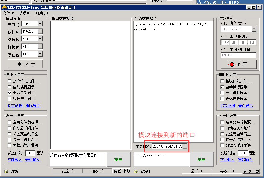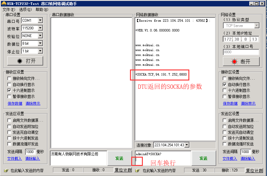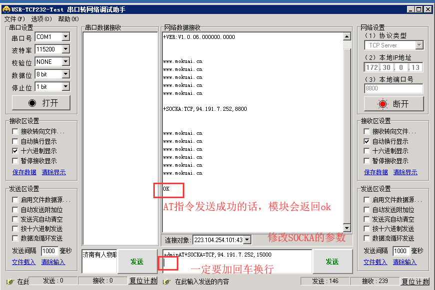 设置SOCKA的参数:adminAT+SOCKA=”TCP”,”94.191.7.252”,15000