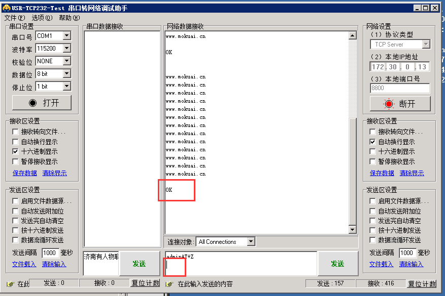 注意:修改的参数都需要重启后才能生效,所以最后发送adminAT+Z重启DTU